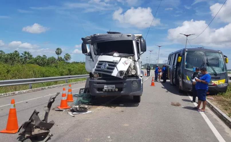 O condutor do caminhão e o motorista do micro-ônibus têm versões diferentes sobre como aconteceu o acidente.