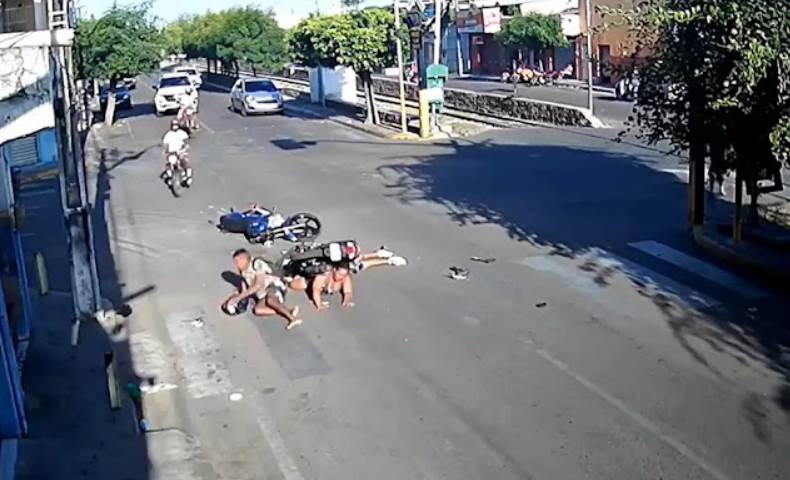 Uma colisão entre duas motocicletas deixou três pessoas feridas no cruzamento da Avenida Carlos Cruz com a Rua São Benedito (bairro Franciscanos), em Juazeiro do Norte, na manhã deste domingo (19 de setembro). Uma mulher fica sob a motocicleta, e um homem desmaia após o impacto. O acidente foi registrado por uma câmera de segurança. (Assista no vídeo abaixo).