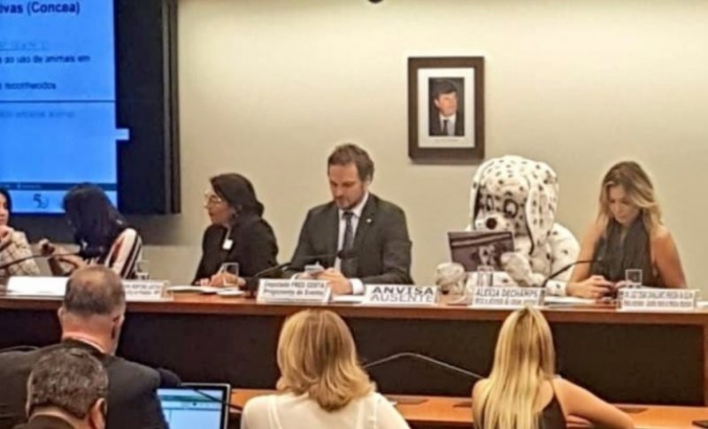 A ideia foi do deputado Fred Costa (Patriota), presidente da Frente Parlamentar dos Animais. “Já que a Anvisa não se faz presente, eu vou convidar aquele que simboliza todos os animais para compor a mesa”, disse Fred.