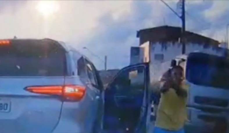 Câmeras de segurança de um veículo modelo Cherry, que também foi alvo dos criminosos, flagraram o momento em que um dos suspeitos desce da Hilux com uma arma na mão e sai na direção do veículo Cherry. O segundo assaltante sai logo em seguida da Hilux, que é automática e acaba colidindo com um carro estacionado.