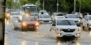 Carro cai em buraco durante alagamento em Fortaleza