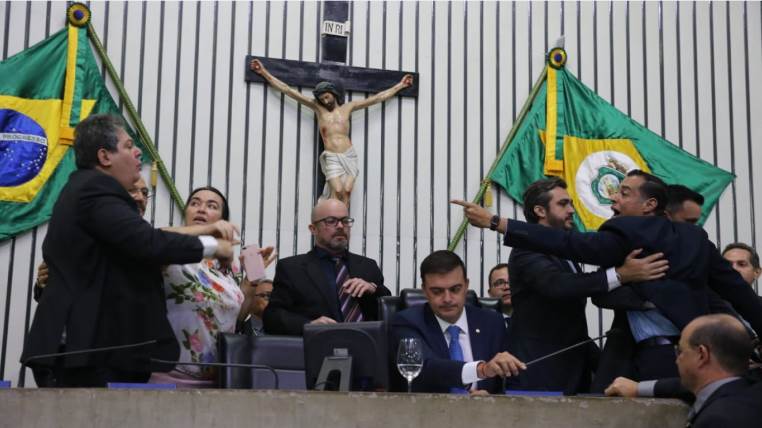 Os deputados Osmar Baquit (PDT) e Leonardo Araújo (MDB) tiveram de ser contidos em cima da mesa diretora da Assembleia Legislativa do Ceará, na manhã desta terça-feira (10), em meio a bate-boca agressivo entre eles. Baquit chegou a chamar Araújo de “moleque, comprador de voto”, e ouviu um “garganta de aluguel”, em resposta do adversário.