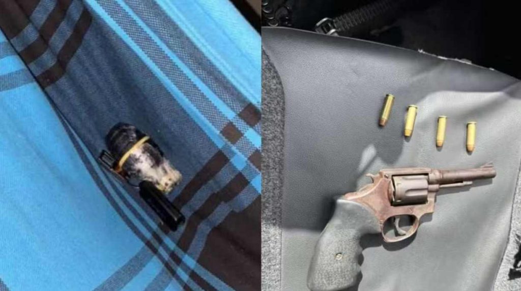 Contra o homem, havia um mandado de prisão em aberto pelo crime de roubo. Ele foi capturado com a granada, um revólver cal. 38 com a numeração suprimida, um celular, além de munições e placas de veículos.