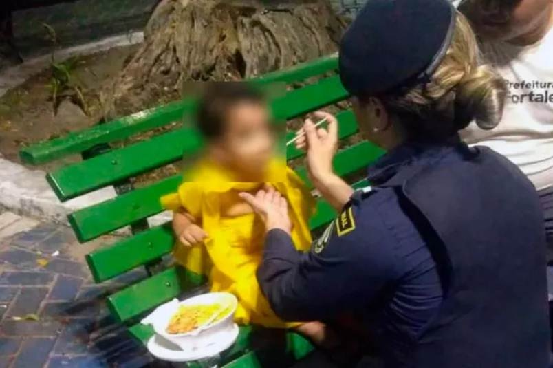 Uma criança com cerca de dois anos foi resgatada por uma equipe da Guarda Municipal após ser encontrada chorando na Praça Pedro II, no Centro de Fortaleza, na noite desta quarta-feira (19). Os agentes limparam e alimentaram o menino, que estava sujo e faminto.