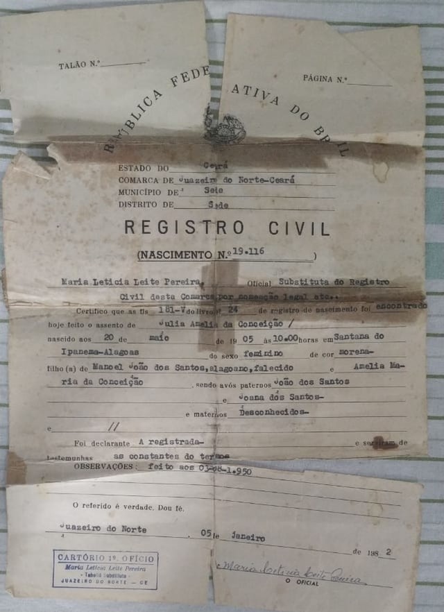 Uma moradora de Juazeiro do Norte está completando, nesta segunda-feira (20), 114 anos de idade. A certidão de nascimento de Júlia Amélia da Conceição, comprovando a data em que ela foi registrada — 20 de maio de 1905 — anuncia as marcas do tempo pelo amarelado e puído do papel. A idosa é natural de Alagoas e mora no Cariri cearense desde jovem, ela diz. Nesta segunda, a família comemora os 114 anos de vida dela.