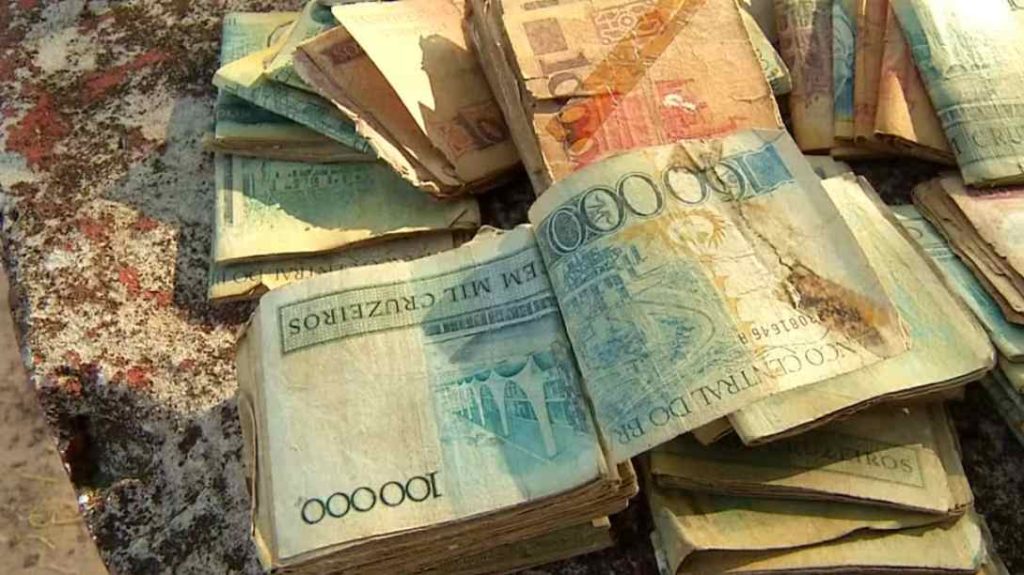 O “tesouro” é composto por notas e moedas do Cruzado, moeda que circulou no Brasil entre 1986 e 1989.