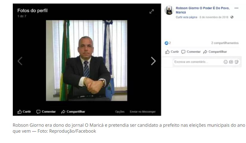 Robson Giorno era dono do jornal ‘O Maricá’ e, segundo sua página pessoal em uma rede social, pretendia ser candidato a prefeito nas eleições municipais do ano que vem. Ele era filiado ao partido Avante.