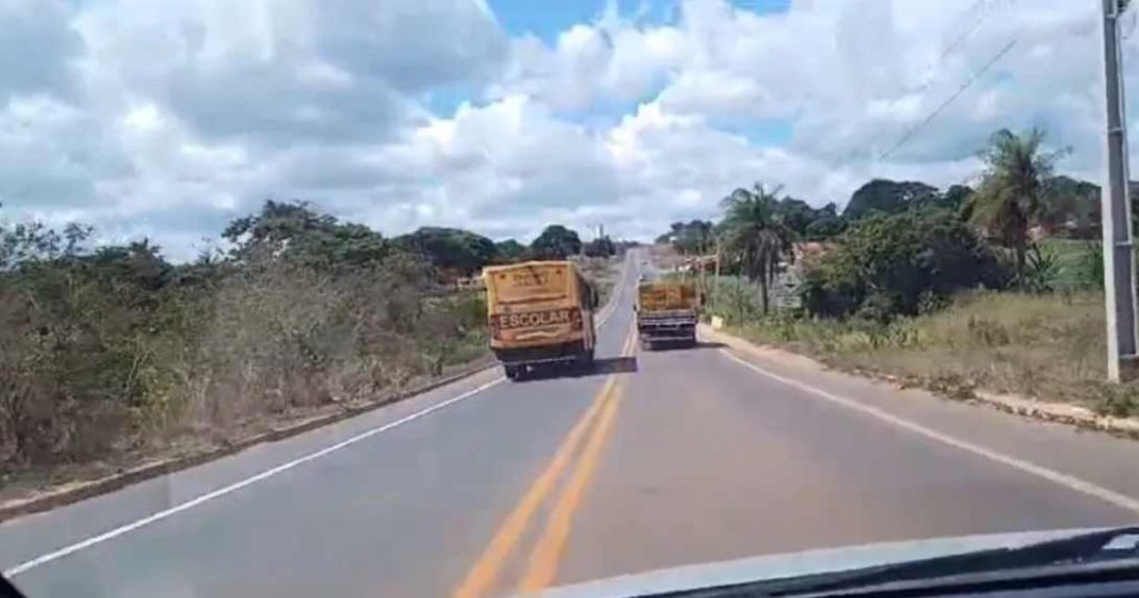 O motorista de um ônibus escolar fez uma ultrapassagem proibida na entrada do município de Tianguá, no interior do Ceará. O flagra foi registrado em vídeo por um condutor na manhã desta segunda-feira (04). Segundo ele, o veículo transportava estudantes no momento.