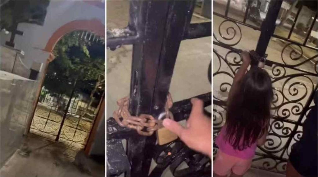 O vídeo do momento mostra as três chegando até o portão do cemitério e notando o cadeado envolto na corrente. Ela estava acompanhada da cunhada, identificada como Paulinha, e a filha pequena, que começou a chorar.