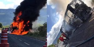 Ônibus com professores e estudantes pega fogo, em Reriutaba