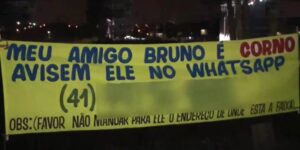 Uma faixa com o seguinte aviso: ‘Meu amigo Bruno é corno. Avisem ele no WhatsApp’, seguida do número de telefone do rapaz, e fixada em uma rua movimentada de Curitiba, …
