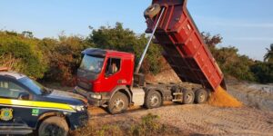 A Polícia Rodoviária Federal (PRF) flagrou um caminhão extraindo de areia de forma ilegal. O responsável pelo estabelecimento foi encaminhado à Polícia Federal.