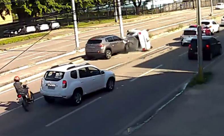 O veículo Gol, no entanto, acabou tombando com o impacto da colisão. Um quarto carro, modelo Jeep SUV, que vinha na faixa rápida, bateu no Gol, fazendo-o desvirar e voltar a ficar com as quatro rodas sobre a pista.